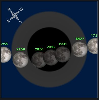 - 20:53 Luna začne zapuščati Zemljino senco. Popolni mrk se konča.